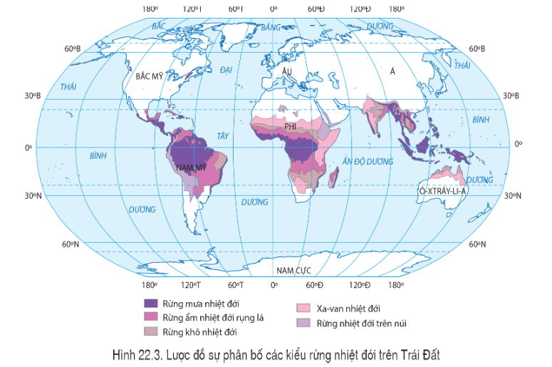 Câu hỏi 1 SGK Địa lí 6 Cánh Diều Bài 22 (trang 182): Đọc thông tin và quan sát hình 22.3, hãy xác định phạm vi phân bố của các kiểu rừng nhiệt đới trên Trái Đất?