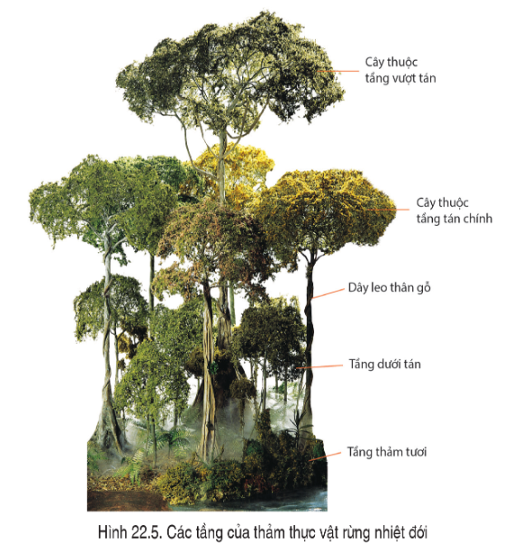- Cấu trúc của rừng nhiệt đới từ thấp đến cao: Tầng thảm lưới -> Tầng dưới tán -> Dây leo thân gỗ -> Cây thuộc tầng tán chính -> Cây thuộc tầng vượt tán.