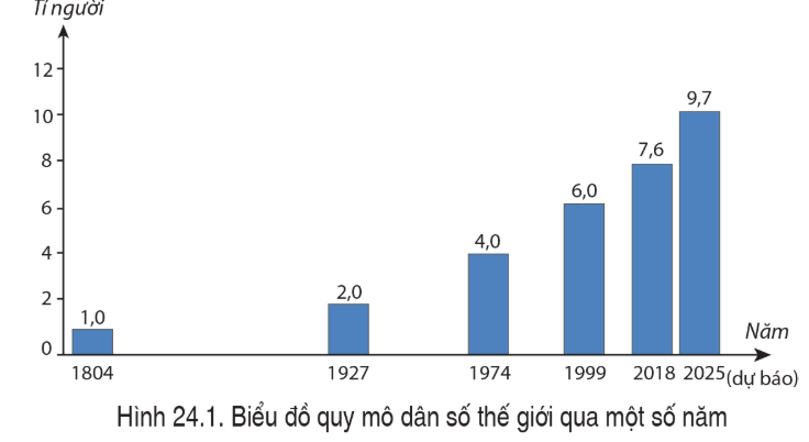 Quan sát biểu đồ quy mô dân số thế giới hình 24.1, ta thấy: