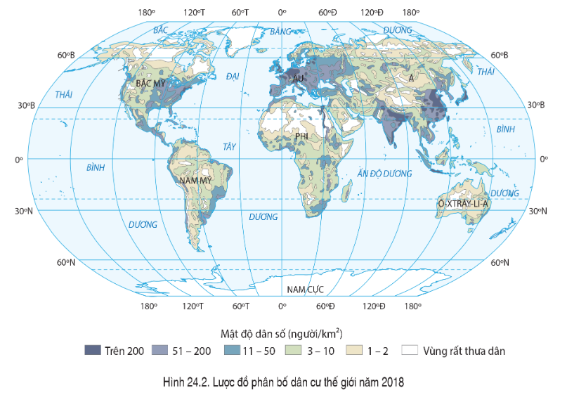 + Những khu vực có mật độ dân số trên 200 người/km2 là: Trung tâm châu Á, phía Bắc của Bắc Mỹ, Châu Phi, lục địa Ô-xtrây-ly-a.