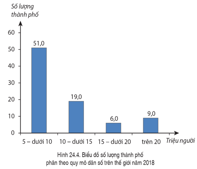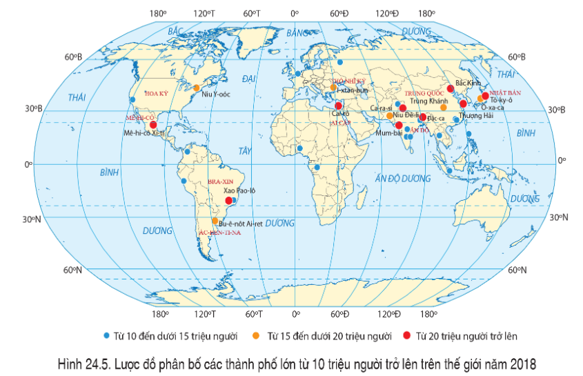 Câu hỏi 1 SGK Địa lí 6 Cánh Diều Bài 24 (trang 187): Quan sát hình 24.4, hãy cho biết năm 2018 trên thế giới có bao nhiêu thành phố có quy mô dân số từ 5 triệu người trở lên.