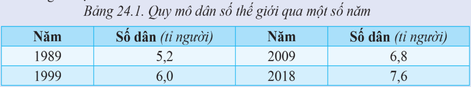 - Dân số thế giới tăng nhanh qua các năm, tăng từ 5,2 tỉ người (1989) lên 7,6 tỉ người (2018), tăng thêm 2,4 tỉ người.