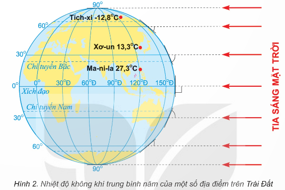 + Càng lên gần cực, góc chiếu của tia sáng mặt trời càng nhỏ, mặt đất nhận được ít nhiệt hơn, không khí trên mặt đất cũng ít nóng hơn: Xơ-un (vĩ độ trung bình), Tích-xi (vĩ độ cao) nên nhiệt độ trung bình năm của không khí thấp dần.
