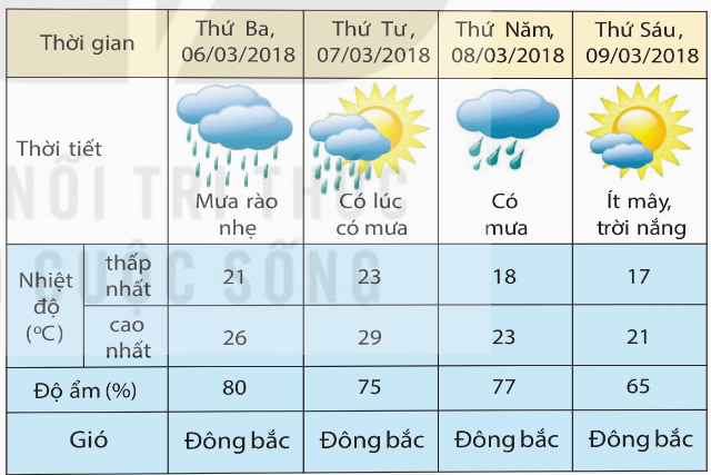 - Mô tả đặc điểm thời tiết của từng ngày trong bảng.