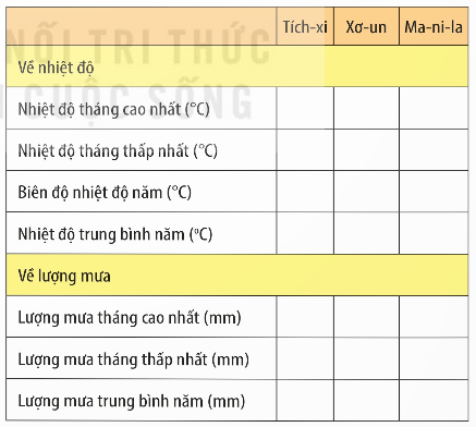 - Hoàn thành bảng gợi ý theo mẫu sau vào vở để đọc được biểu đô nhiệt độ, lượng mưa của Tich-xi, Xơ-un, Ma-ni-la.