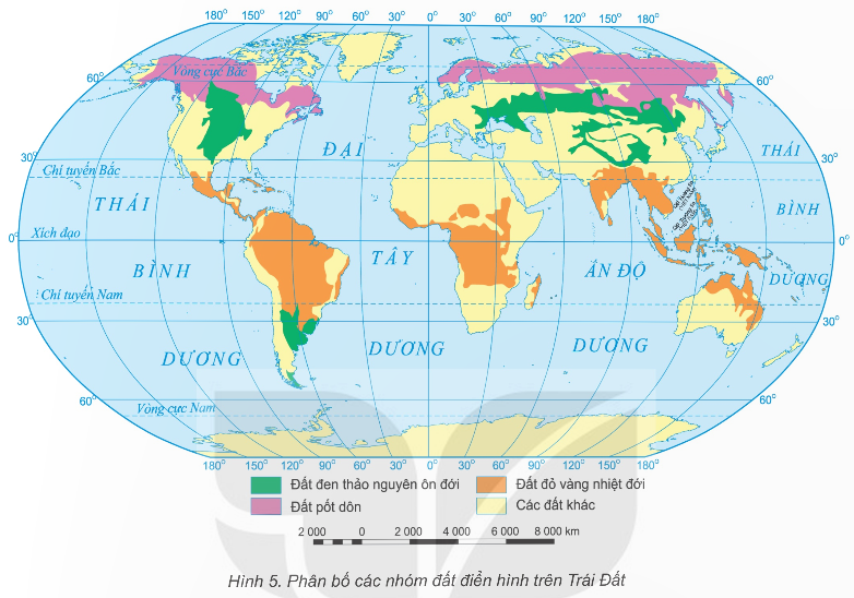 Câu hỏi: Xác định trên hình 5 nơi phân bố chủ yếu của ba nhóm đất: đất đen thảo nguyên ôn đới, đấy pốt dôn, đất đỏ vàng nhiệt đới