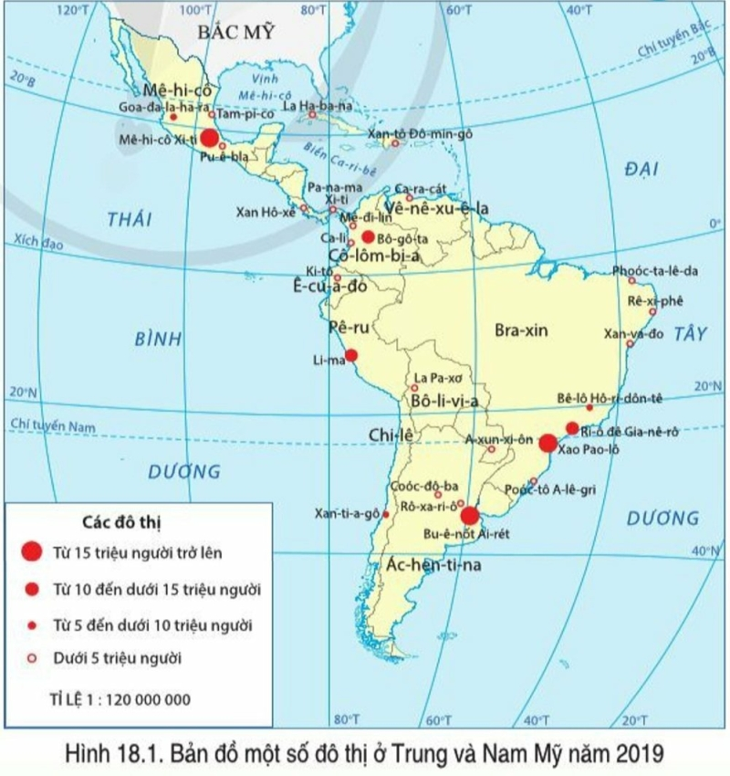 Câu hỏi 1 SGK Địa lí 7 Cánh Diều Bài 18 (trang 140): Dựa vào hình 18.1, hãy kể tên các đô thị có từ 10 triệu dân trở lên ở khu vực Trung và Nam Mỹ.