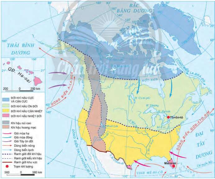 Câu hỏi 2 SGK Địa Lí 7 Chân trời sáng tạo Bài 14 (trang 145): Dựa vào hình 14.2 và thông tin trong bài, em hãy trình bày sự phân hoá khí hậu Bắc Mỹ theo chiều bắc - nam và theo chiều đông - tây.