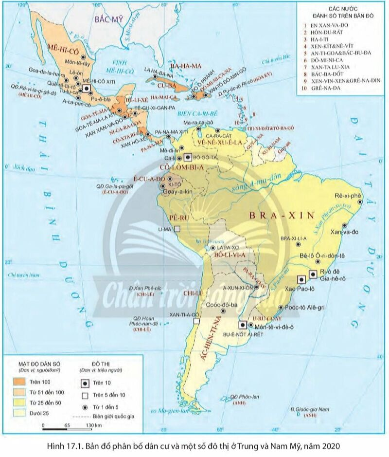 Câu hỏi 2 SGK Địa Lí 7 Chân trời sáng tạo Bài 17 (trang 159): Dựa vào hình 17.1, em hãy nhận xét đặc điểm phân bố các đô thị ở Trung và Nam Mỹ.