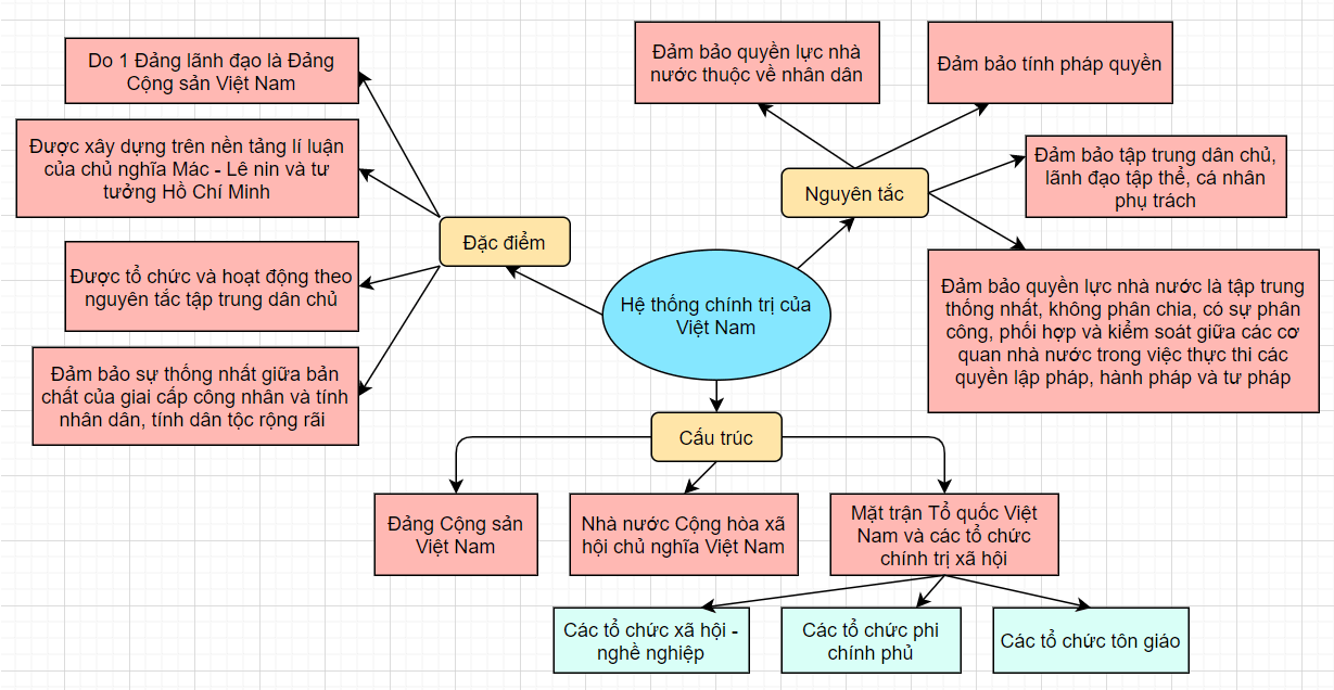 Vận dụng 1 SGK Kinh tế Pháp luật 10 Cánh diều Bài 11 (trang 70): Em hãy sử dụng sơ đồ tư duy để mô tả lại cấu trúc, đặc điểm, nguyên tắc của hệ thống chính trị Việt Nam.