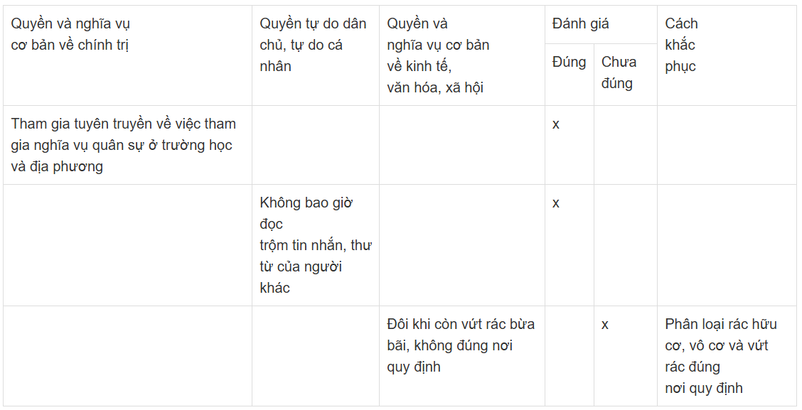 Bài tập 3 SGK Kinh tế Pháp luật 10 Cánh diều Bài 16 (trang 102): Em hãy kể tên các quyền con người, quyền và nghĩa vụ công dân mà em đang thực hiện ở gia đình, nhà trường và ngoài xã hội và nêu cách khắc phục với những quyền và nghĩa vụ mà em thực hiện chưa đúng theo gợi ý sau: