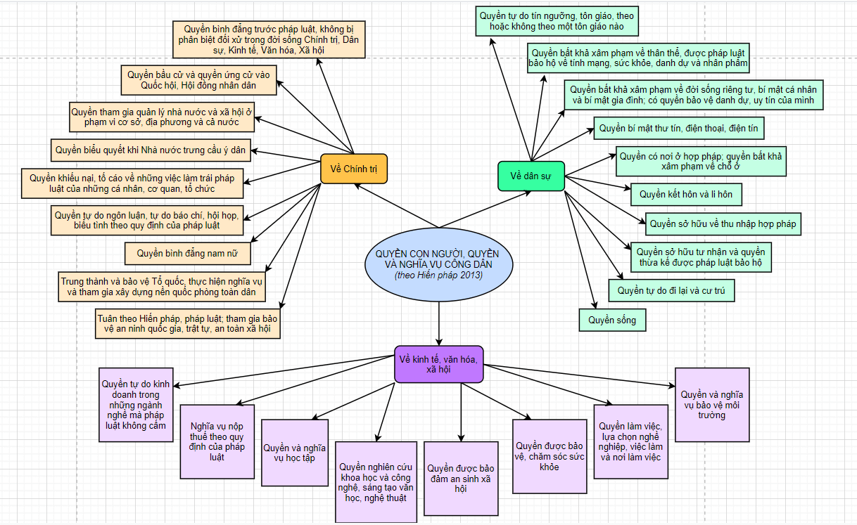 Vận dụng 2: Vẽ sơ đồ tư duy về quyền con người, quyền và nghĩa vụ của công dân theo nội dung của Hiến pháp năm 2013 và chia sẻ với bạn bè, mọi người xung quanh.