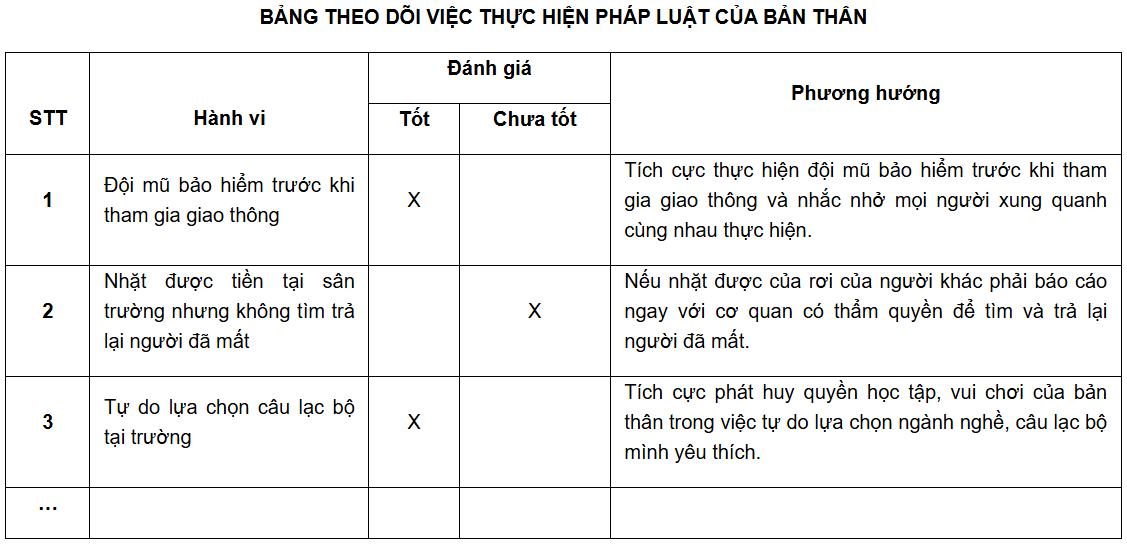 Vận dụng 1: Mỗi học sinh lập một bảng theo dõi việc thực hiện pháp luật của bản thân: ở nhà, ở trường, ở nơi công cộng.