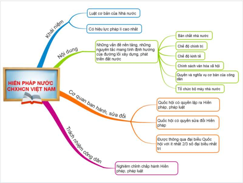 Vận dụng 1 SGK Kinh tế Pháp luật 10 Chân trời sáng tạo Bài 20 (trang 138): Em hãy tóm tắt nội dung đã học về Hiến pháp năm 2013 bằng sơ đồ tư duy và thuyết trình trước lớp.