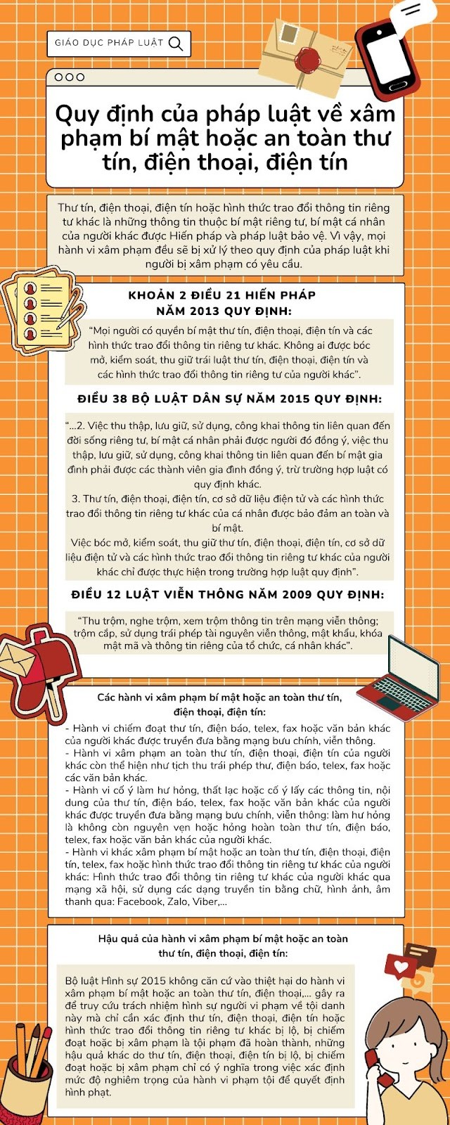 + Tìm hiểu các quy định của pháp luật về quyền được bảo đảm an toàn và bí mật thư tín, điện thoại, điện tín của công dân.