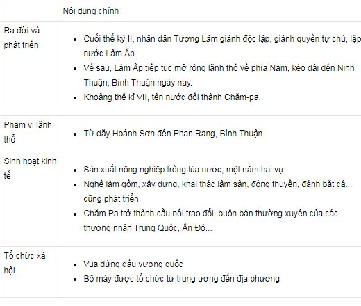 Câu hỏi 1 SGK Lịch sử 6 Cánh Diều Bài 18 (trang 94): Lập bảng tóm tắt những nét chính về sự ra đời, phát triển, phạm vi lãnh thổ, sinh hoạt kinh tế và tổ chức xã hội của vương quốc Chăm-pa.