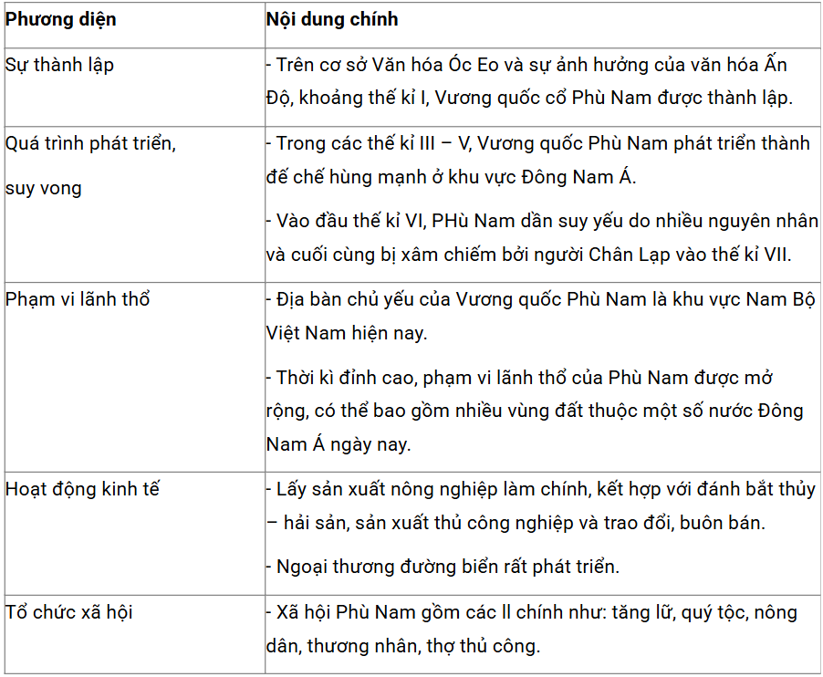Câu hỏi 1 SGK Lịch sử 6 Cánh Diều Bài 19 (trang 98): Lập bảng tóm tắt những nét chính về: sự thành lập, phát triển, suy vong, phạm vi lãnh thổ; hoạt động kinh tế và tổ chức xã hội của Vương quốc Phù Nam.