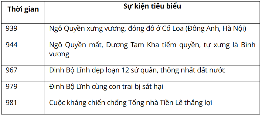 Câu hỏi 2 SGK Lịch sử 7 Cánh Diều Bài 13 (trang 46): Lập bảng thống kê những sự kiện tiêu biểu tương ứng với các mốc thời gian: 939, 944, 967, 968, 979, 981.