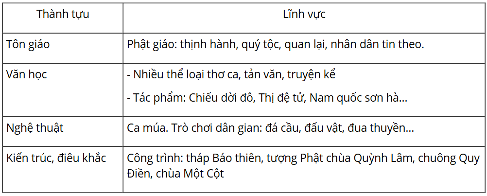 - Nêu một số thành tựu văn hoá chủ yếu thời Lý.