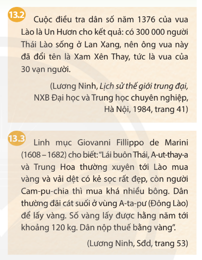 Câu hỏi mục 2 SGK Lịch Sử 7 Chân trời sáng tạo Bài 13 (trang 49): Dựa vào thông tin trong bài, đọc các tư liệu 13.2, 13.3 em hãy nêu những biểu hiện về sự phát triển của vương quốc Lào thời Lan Xang.