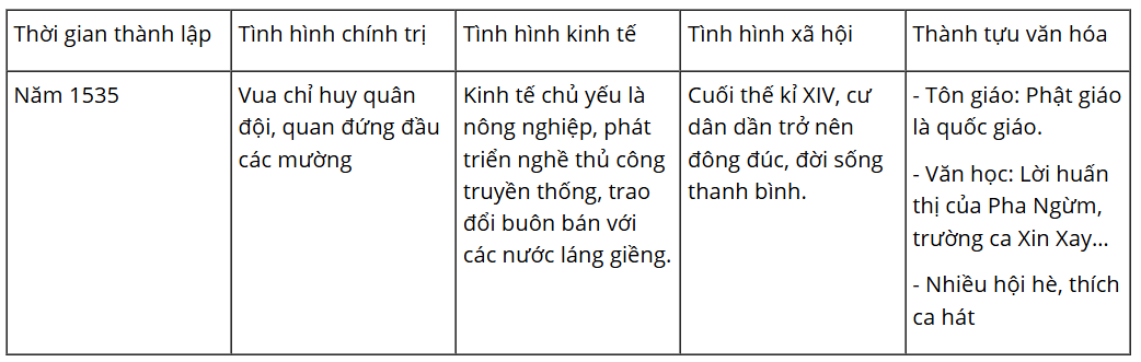 Câu hỏi 1 SGK Lịch Sử 7 Chân trời sáng tạo Bài 13 (trang 50): Hoàn thành bảng tóm tắt lịch sử vương quốc Lào thời Lan Xang theo mẫu sau: