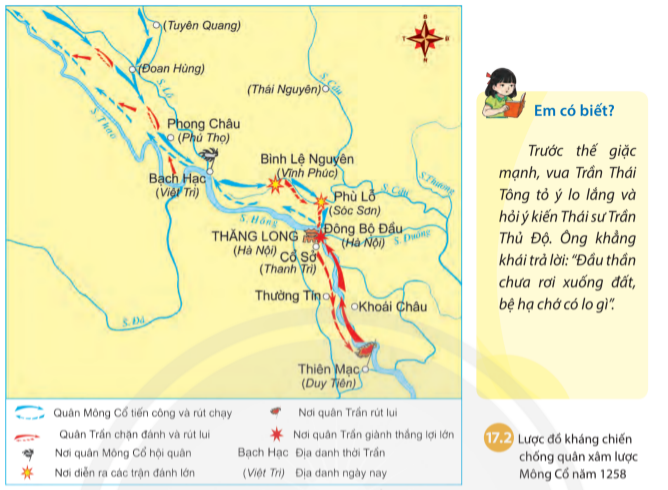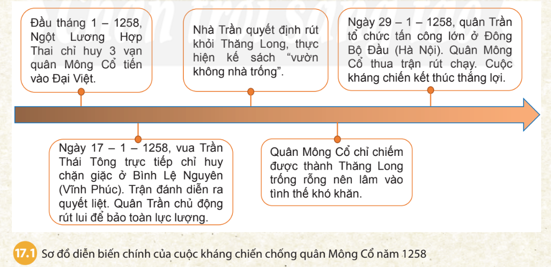 Câu hỏi mục 1 SGK Lịch Sử 7 Chân trời sáng tạo Bài 17 (trang 71): Dựa vào sơ đồ 17.1 và lược đồ 17.2, hãy trình bày diễn biến chính của cuộc kháng chiến chống quân Mông Cổ năm 1258.