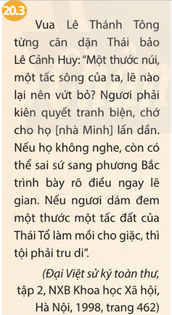 Câu hỏi 2 SGK Lịch Sử 7 Chân trời sáng tạo Bài 20 (trang 86): Đọc tư liệu 20.3 và cho biết chủ trương bảo vệ chủ quyền lãnh thổ quốc gia của triều Lê sơ được thể hiện thế nào qua lời căn dặn của vua Lê Thánh Tông.