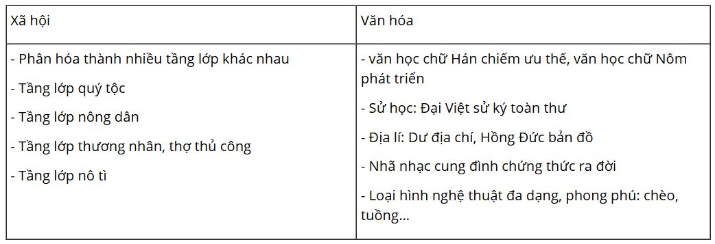 Câu hỏi 2 SGK Lịch Sử 7 Chân trời sáng tạo Bài 20 (trang 91): Lập bảng thống kê về tình hình xã hội và văn hóa thời Lê Sơ
