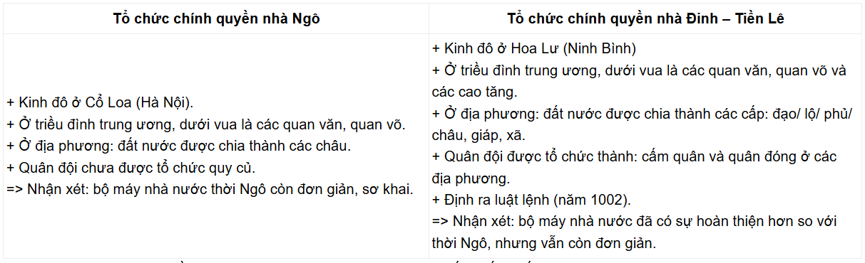 Câu 1. So sánh tổ chức chính quyền thời Đinh và Tiền Lê với thời Ngô.