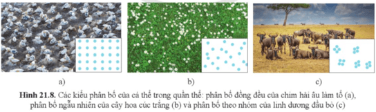 Câu hỏi 9: Quan sát hình 21.8, mô tả và phân biệt ba kiểu phân bố của quần thể sinh vật.