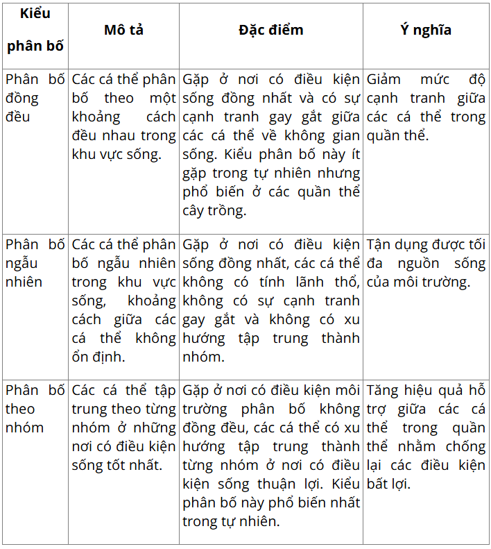 - Phân bố theo nhóm: Các cá thể tập trung theo từng nhóm ở những nơi có điều kiện sống tốt nhất.
