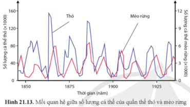Câu hỏi 15: Quan sát hình 21.13 và mô tả mối quan hệ giữa số lượng thỏ và số lượng mèo rừng.