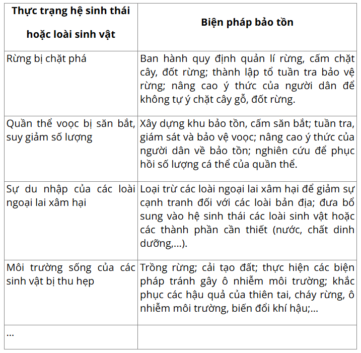 Câu hỏi 3: Hãy nêu biện pháp bảo tồn sinh vật có nguy cơ tuyệt chủng khi môi trường sống của chúng đang ngày càng bị thu hẹp.