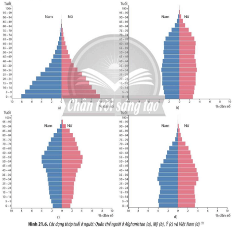 Câu hỏi 7: Quan sát Hình 21.6, hãy xác định các dạng tháp tuổi của một số quần thể người. Từ đó, cho biết trạng thái của mỗi quần thể.