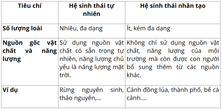Câu hỏi 3: Phân biệt hệ sinh thái tự nhiên với hệ sinh thái nhân tạo bằng cách hoàn thành bảng mẫu sau: