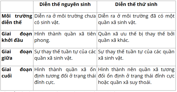 Câu hỏi 11: Lập bảng phân biệt diễn thế nguyên sinh và diễn thế thứ sinh.