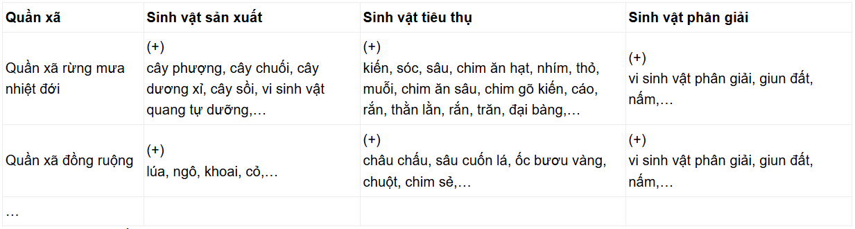 - Bảng thành phần cấu trúc dinh dưỡng trong quần xã: