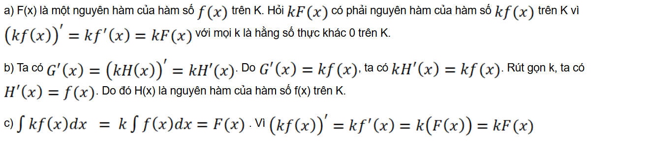 a) Giả sử F(x) là một nguyên hàm của hàm số f(x) trên K. Hỏi kF(x) có phải là nguyên hàm của hàm số kf(x) trên K hay không?