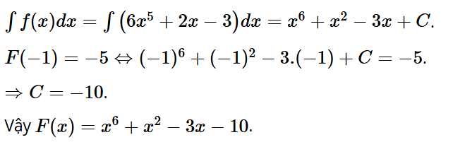 Bài tập 3: Tìm nguyên hàm F(x) của hàm số f(x) = 6x5 + 2x – 3, biết F(– 1) = – 5.