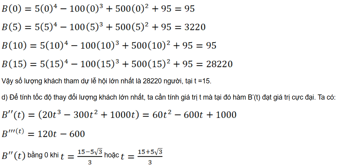 c) Để tính số lượng khách lớn nhất tham dự lễ hội, ta cần tìm giá trị lớn nhất của B(t) trong khoảng 0 ≤ t ≤ 15. Trước tiên ta tìm các điểm cực trị của hàm số B(t) bằng cách giải phương trình đạo hàm B’(t) =0: