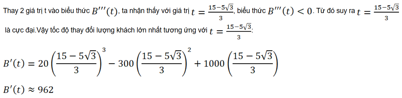 trong đó t tính bằng giờ (0 ≤ t ≤ 15), B'(t) tính bằng khách/giờ.
