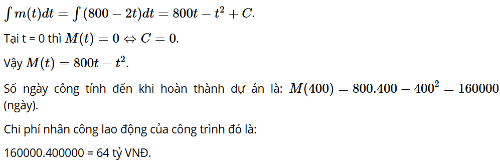 Bài tập 6: Đối với các dự án xây dựng, chi phí nhân công lao động được tính theo số ngày công. Gọi m(t) là số lượng công nhân được sử dụng ở ngày thứ t (kể từ khi khởi công dự án). Gọi M(t) là số ngày công được tính đến hết ngày thứ t (kể từ khi khởi công dự án). Trong kinh tế xây dựng, người ta đã biết rằng M'(t) = m(t). Một công trình xây dựng dự kiến hoàn thành trong 400 ngày. Số lượng công nhân được sử dụng cho bởi hàm số m(t) = 800 – 2t, trong đó t tính theo ngày (0 ≤ t ≤ 400), m(t) tính theo người.