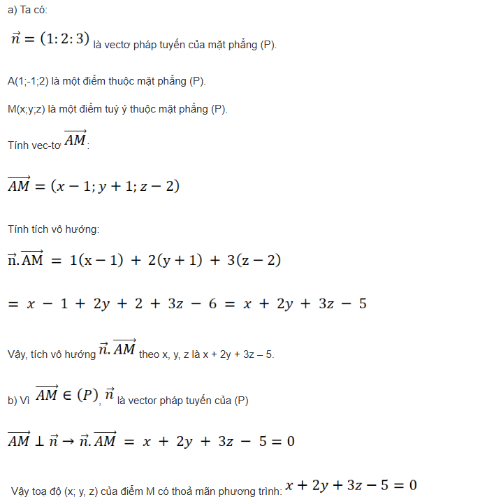 b) Tọa độ (x; y; z) của điểm M có thỏa mãn phương trình: x + 2y + 3z – 5 = 0 hay không?