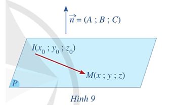 Hoạt động 5: Cho mặt phẳng (P) đi qua điểm I(x0; y0; z0) có là vectơ pháp tuyến. Giả sử M(x; y; z) là một điểm bất kì thuộc mặt phẳng (P) (Hình 9).