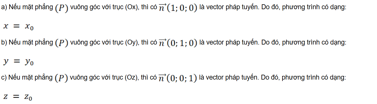 a) Khi mặt phẳng vuông góc với trục Ox, phương trình của nó có dạng: x = c