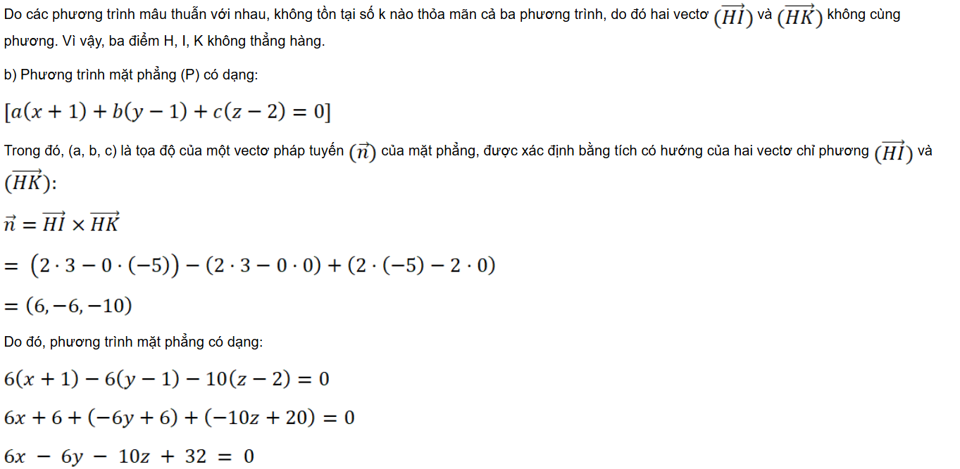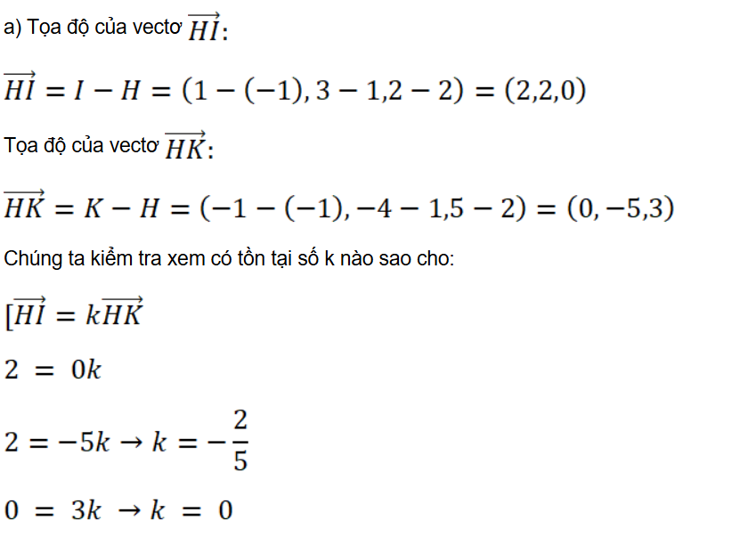 a) Tìm tọa độ của các vectơ . Từ đó hãy chứng tỏ rằng ba điểm H, I, K không thẳng hàng.