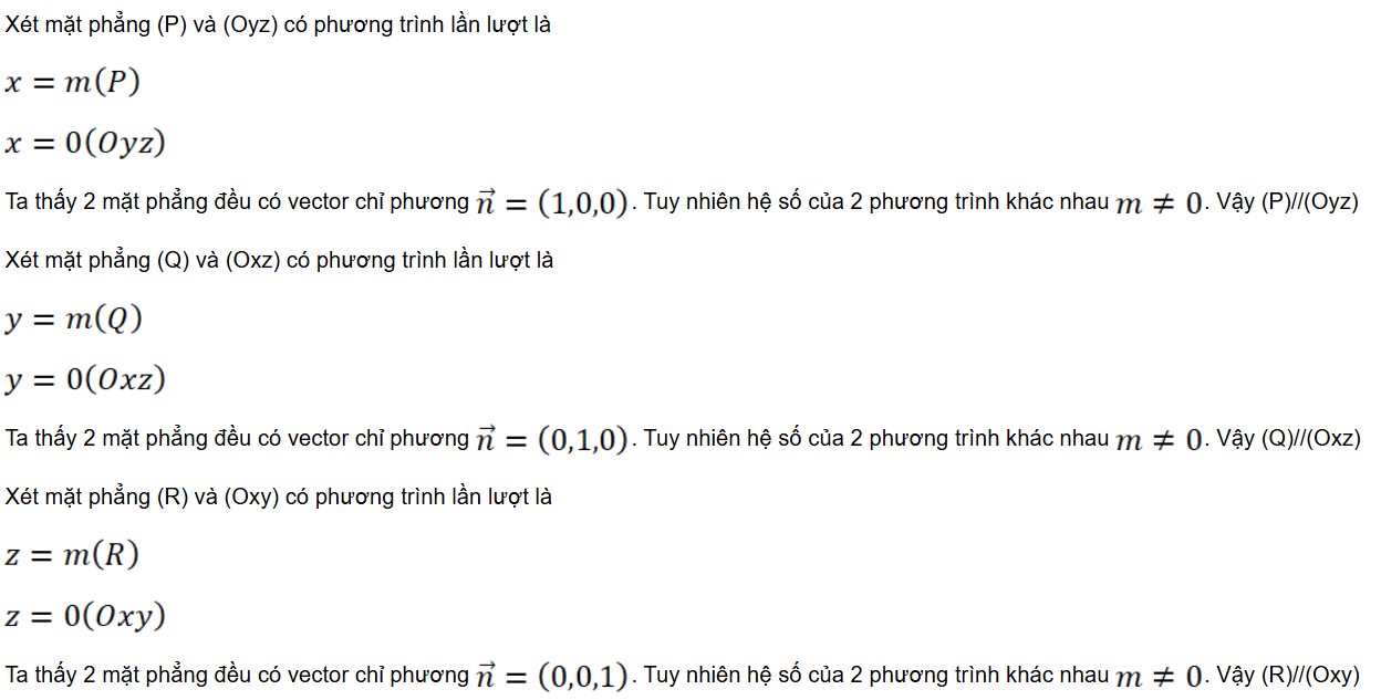 Luyện tập 9: Cho m ≠ 0. Chứng minh rằng các mặt phẳng (P): x – m = 0, (Q): y – m = 0, (R): z – m = 0 lần lượt song song với các mặt phẳng (Oyz), (Ozx), (Oxy).