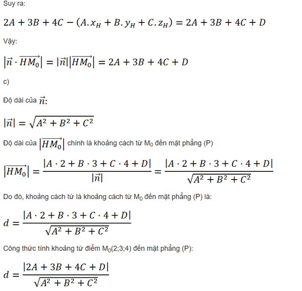 c) Tính các độ dài theo A, B, C, D. Từ đó, hãy nêu công thức tính khoảng cách từ điểm M0(2; 3; 4) đến mặt phẳng (P).