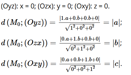 Luyện tập 11: Chứng minh rằng khoảng cách từ điểm M(a; b; c) đến các mặt phẳng (Oyz), (Ozx), (Oxy) lần lượt bằng |a|, |b|, |c|.