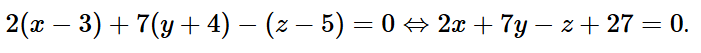 5(x – 1) + 4(y – 3) – 3(z + 2) = 0 ⇔ 5x + 4y – 3z – 23 = 0.